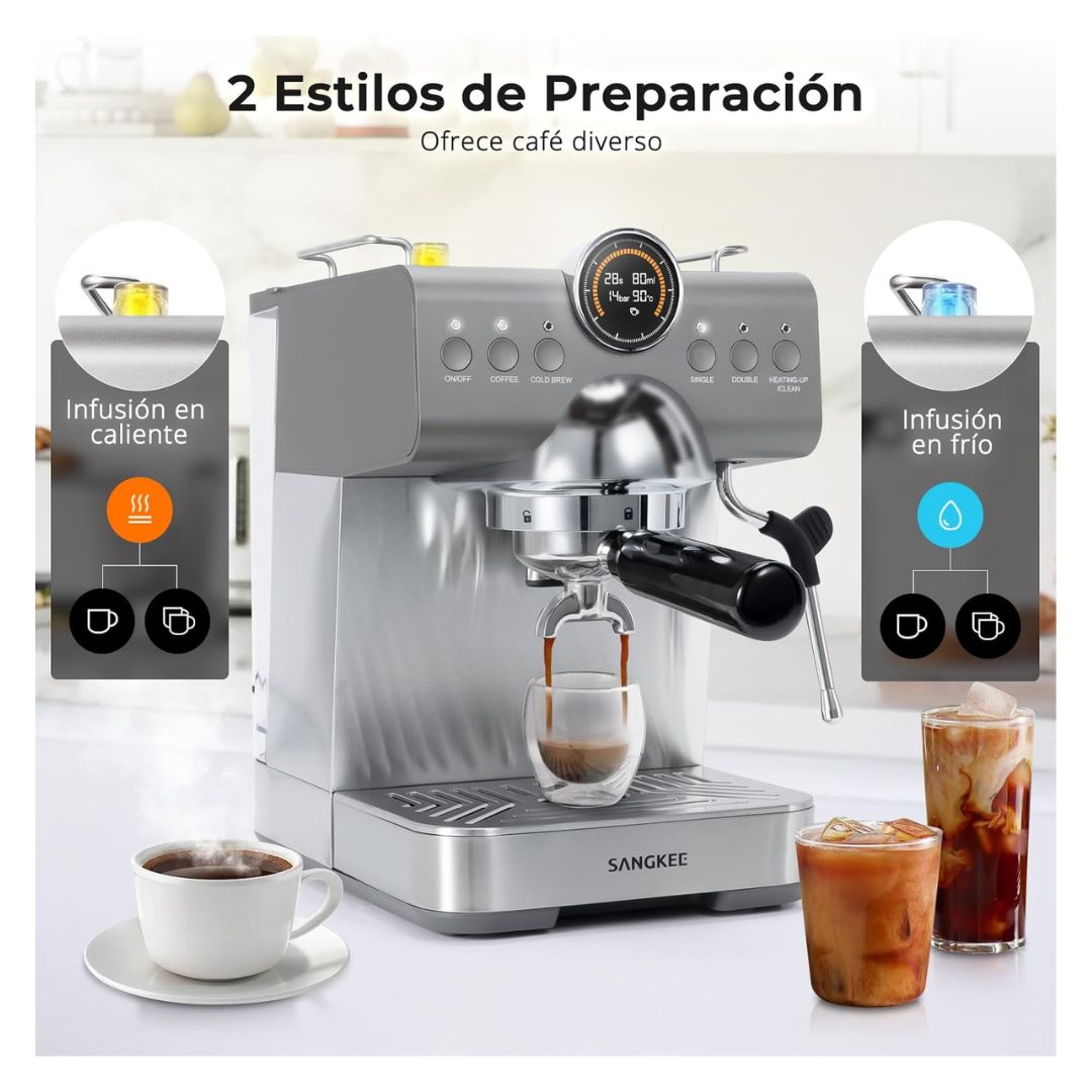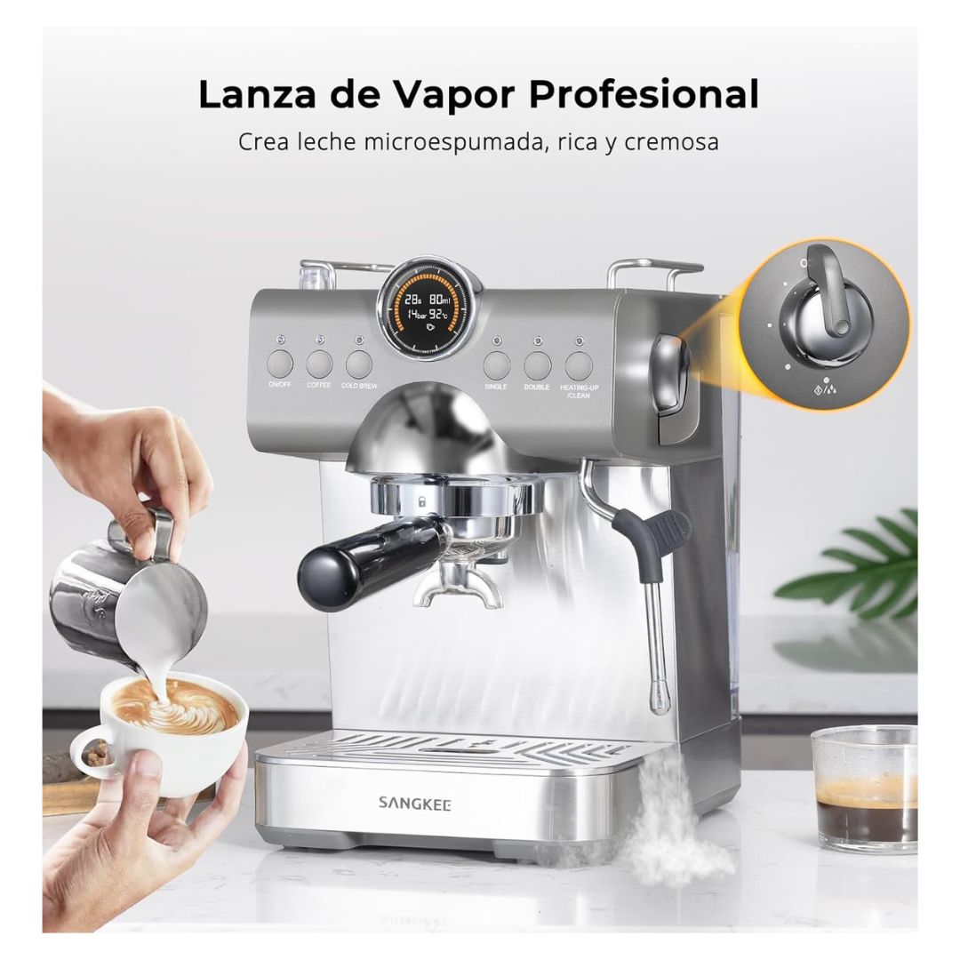 SANGKEE Cafetera Espresso Preparación en Caliente y Frío, Máquina de Café con Vaporizador de Leche y Panel LCD de Temperatura y Tiempo, Ideal para Cappuccino y Latte, 20 Bares