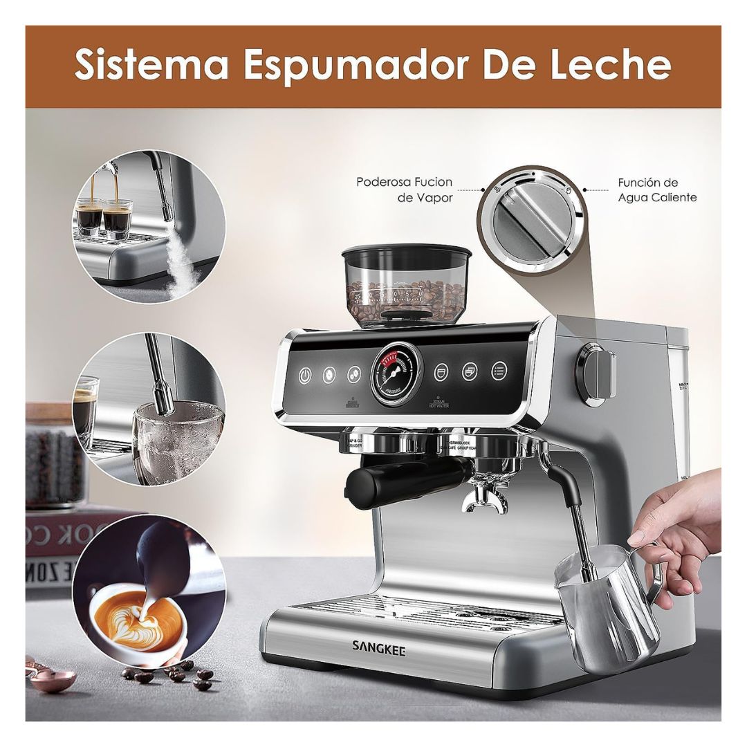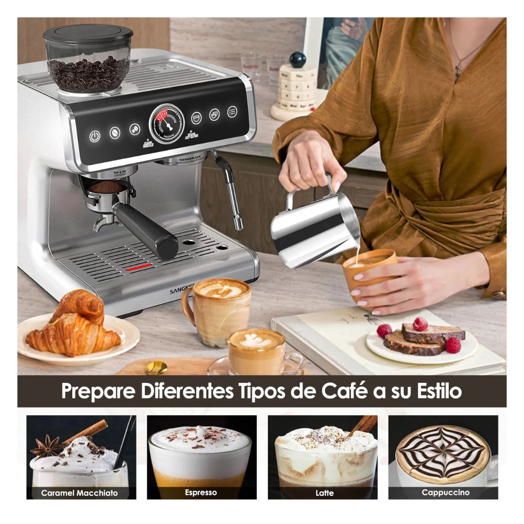 SANGKEE Cafetera Espresso y Capuchino para Negocio 20 Bar,Máquina de Espresso con Sistema de Calentamiento,Espumador de Leche y Molino,Pantalla Táctil,Kit Barista Completo para Capuchinos Lattes