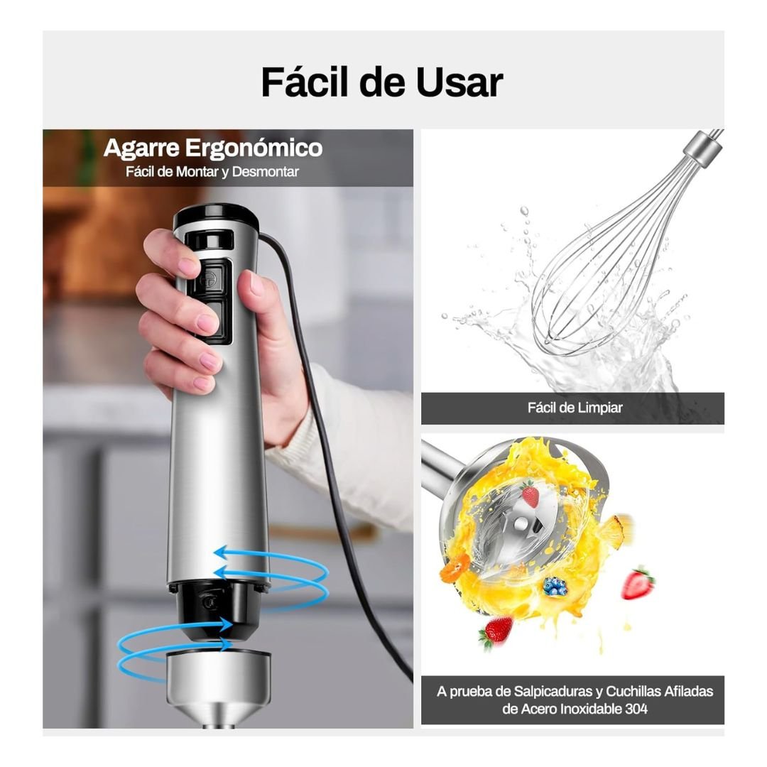 - Batidora de Inmersión de Mano Versátil 4 en 1: Este set incluye una batidora de mano, un tazón picador de 500ml, un vaso medidor de 700ml y un batidor de huevos, satisfaciendo todas tus necesidades para preparar una variedad de alimentos y mejorando tus habilidades culinarias. Cuenta con una carcasa de acero inoxidable de diseño ergonómico y un mango fácil de agarrar, permitiendo un control con una sola mano con facilidad. La batidora eléctrica de mano profesional es un regalo excelente para cualquier ocasión.