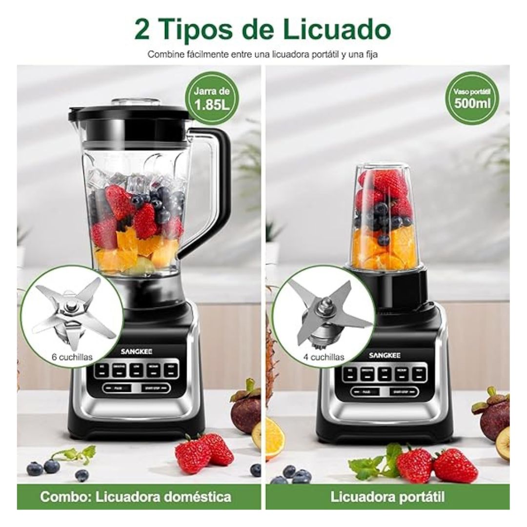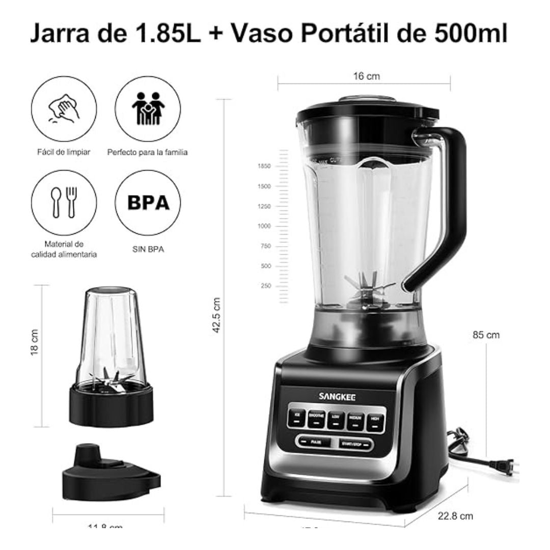 SANGKEE Licuadora Professional Procesador de Alimentos Batidora con 6 Cuchillas, 1.85L Licuadora para Hielo y Frappe, Portatil Vaso de 500ml, Bebidas de Frutas Congeladas Smoothies