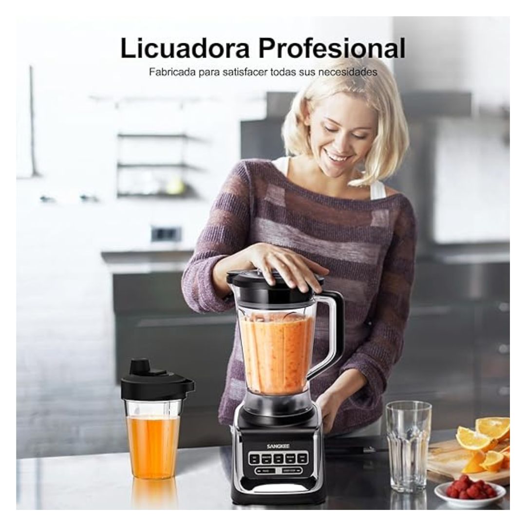 - Licuadora Professional Ayudante de Cocina Todo en Uno: Olvídese de tener una cocina desordenada con miles de utensilios. Esta licuadora multifuncional y procesadora de alimentos cuenta con una jarra de 1.85L para licuar cantidades grandes de comida, y un vaso portátil de 500 ml, el cual, resulta perfecto para preparar bebidas congeladas y smoothies para toda la familia e invitados. Gracias a esta licuadora podrá utilizar menos electrodomésticos ya que está diseñada para satisfacer todas sus necesidades de licuado y procesamiento de alimentos.