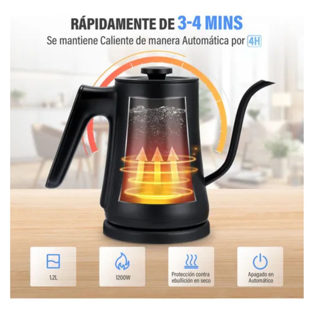 - Hierve agua en 3 a 4 minutos con 1200 watts de potencia, 60% más eficiente que una tetera tradicional